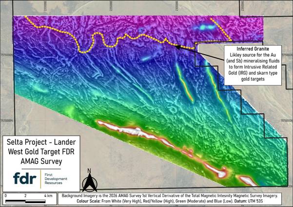 Lander West is interpreted as a continuation of the Stafford Gold Trend, where the adjacent ground hosts high-grade gold and antimony (‘Sb’) mineralisation in the same geological units extending to the southeast (1). Gold mineralisation is believed to be shear-hosted, associated with zones of deformation and hydrothermal alteration, which produce subtle but measurable variations in magnetic response. Within Lander West, a very large granitic batholith, with smaller granite stocks along its margin, have been identified by the AMAG data to sit below thin sand cover sediments, and these granites are a likely source for the Au (and Sb) mineralising fluids to form Intrusive Related Gold (‘IRG’) and skarn type gold targets with FDR’s land holding. High-resolution geophysical datasets are therefore critical to refining drill targets and advancing FDR’s gold exploration programme.