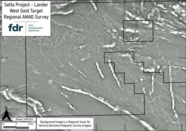 Following detailed desktop studies, FDR has identified the Lander West regional gold target area as a priority focus within the broader Selta Project. This target has been supported by a comprehensive gold targeting study completed by Resource Potentials Pty Ltd (‘ResPot’), a Perth, Western Australia-based Mineral Exploration and Geophysical Consultancy. ResPot has been commissioned to integrate historical drilling, geological, geophysical, and geochemical datasets to help FDR define high-potential gold targets for follow-up work.